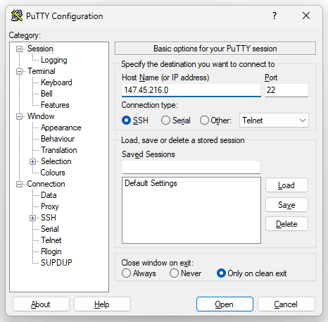 Введите IP-адрес сервера в поле "Host Name". Убедитесь, что порт - 22, а ниже выбрано "SSH". Нажмите "Open".