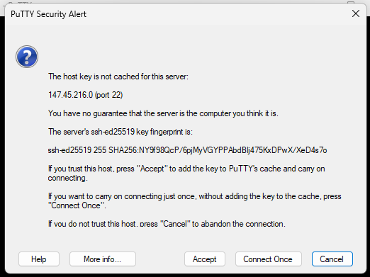 При появлении окошка "PuTTY Security Alert" нажмите "Accept". Учтите, что окошко может и не появиться.