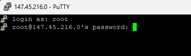При запросе "login as:" введите "root" и нажмите Enter. Затем в поле "password" введите пароль.