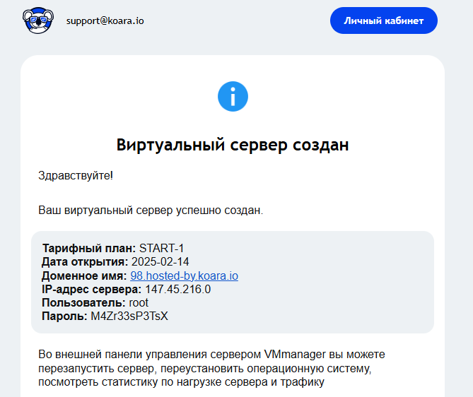 После приобретения сервера вы получите письмо с данными для доступа к нему. Копируем IP-адрес, пароль root и подключаемся к нему по SSH.