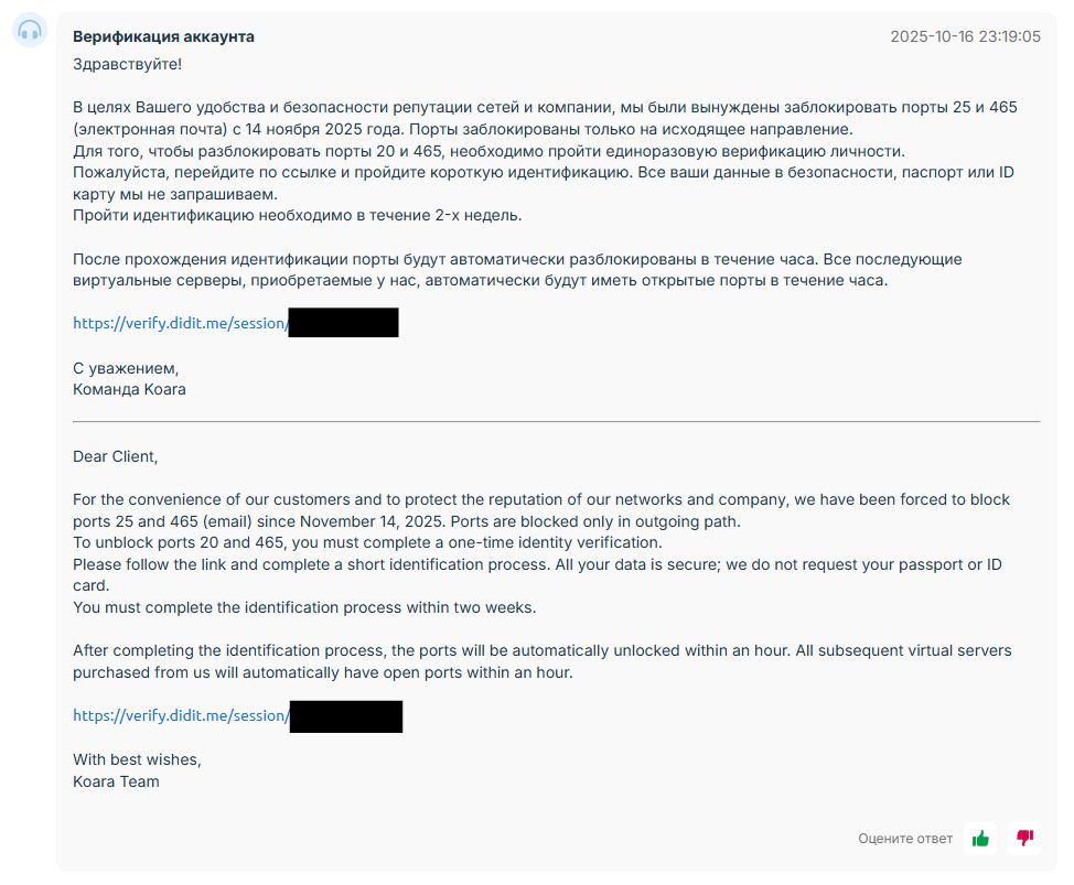 После отправки запроса наш бот пришлет инструкцию по разблокировке. В ответе будет приложена ссылка на прохождение идентификации. В рамках запроса писать более ничего не нужно, все обращения будут проигнорированы, так как не доходят до наших сотрудников.